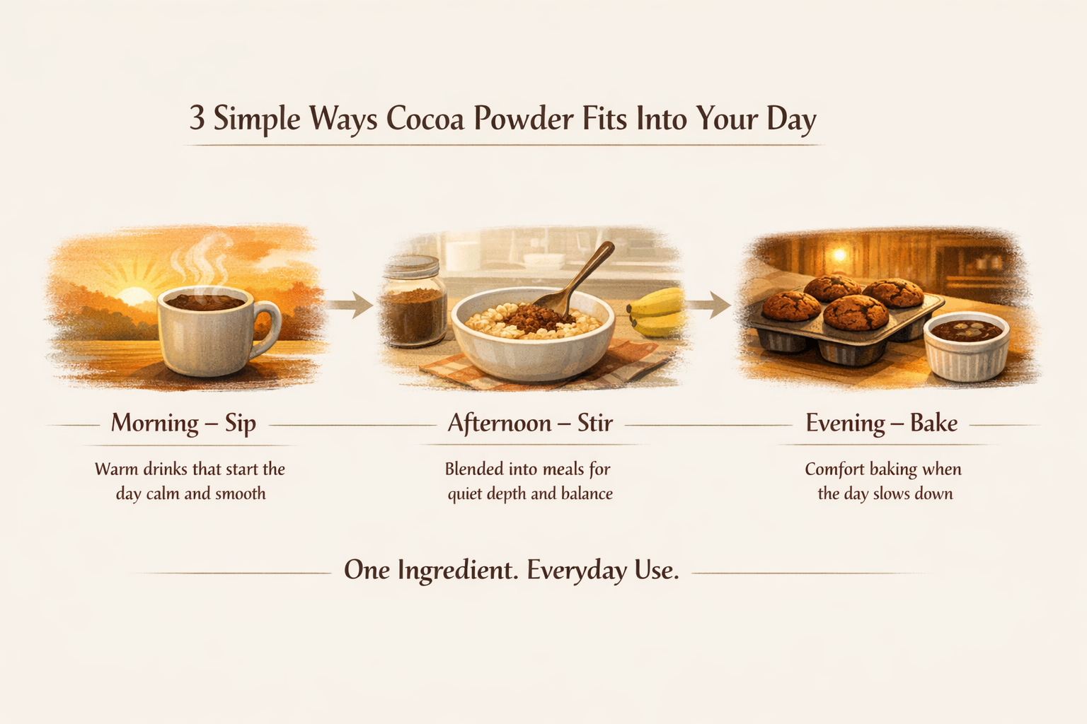 Cocoa powder no longer waits for birthdays, holidays or special plans. It shows up in quiet mornings when the house is still, in rushed afternoons when meals need to come together fast and in calm evenings when comfort matters most. It doesn’t ask for attention or effort. It simply fits.